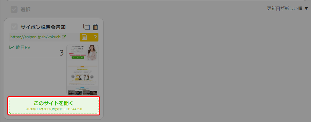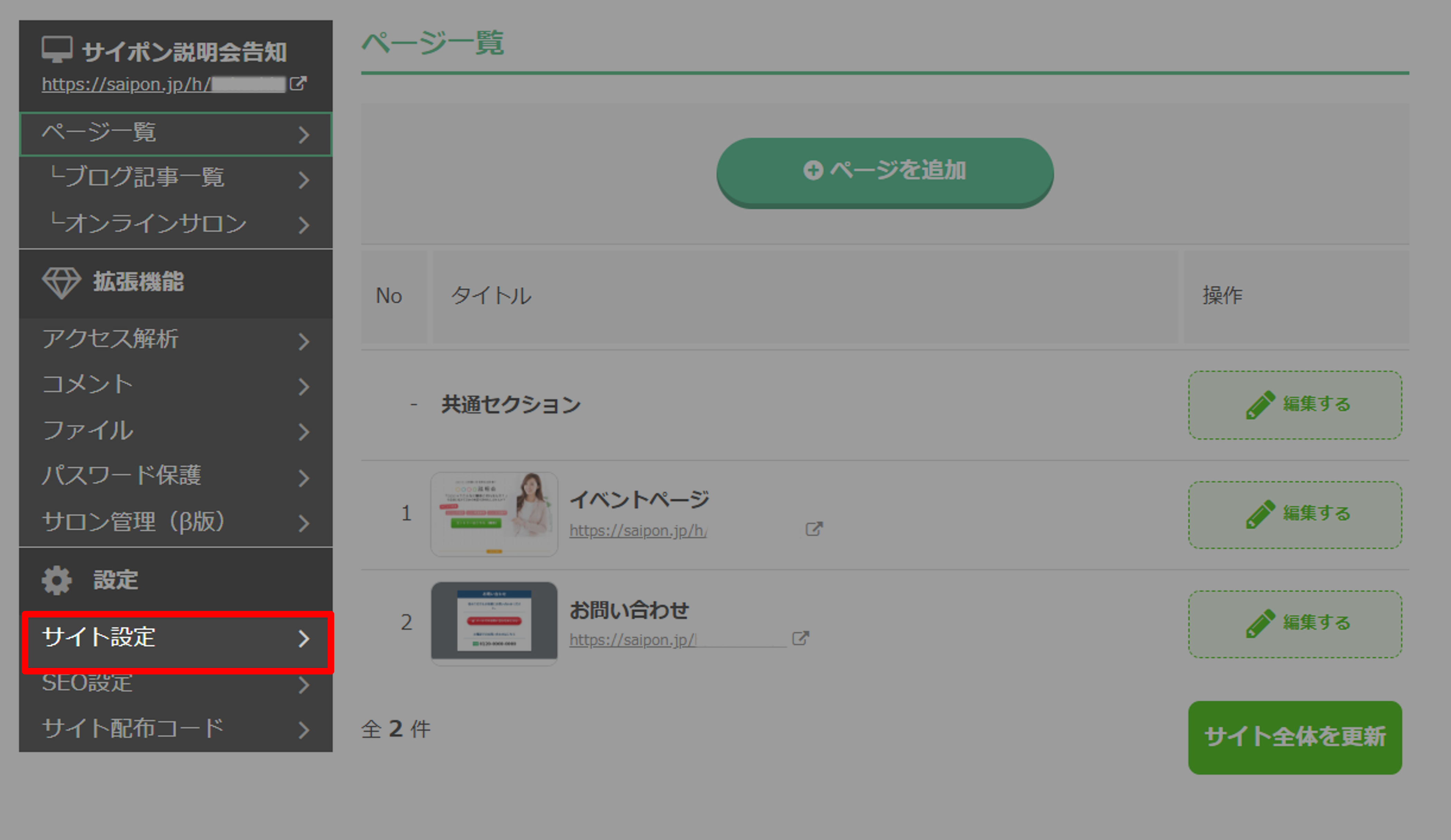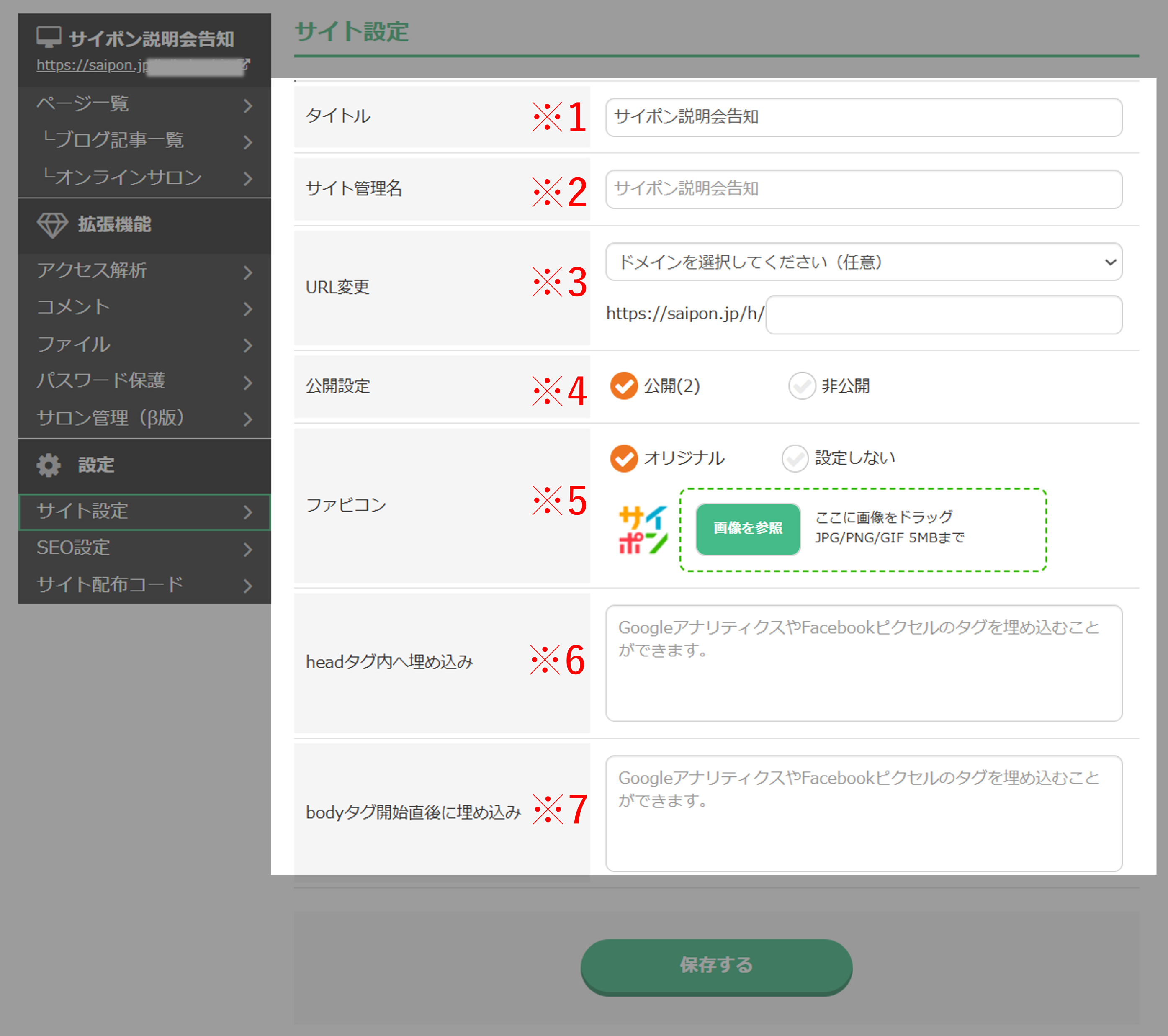 ※1 タイトル 詳細はこちら → 「サイト名を変更する」 ※2 サイト名管理 管理用のサイト名が設定できます。 ※3 URL変更 詳細はこちら → 「サイトURLを変更する」 ※4 公開設定 サイトの公開、非公開の設定ができます。